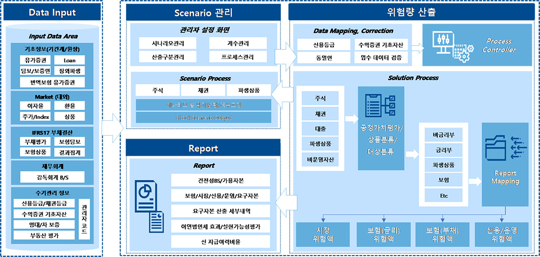 보험사의 신지급여력제도를 시스템에 구성하고 요구자본 중 금리 리스크는 자산에 금리 충격시나리오를 적용하여 가치 평가 및 시뮬레이션 기능을 제공하는 솔루션입니다.